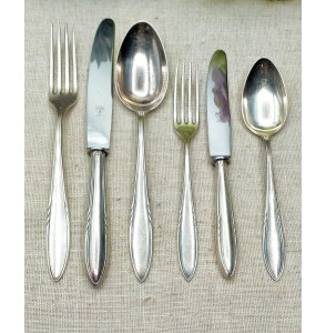 6 tenedores, 6 cuchillos, 6 cucharas de comida, 6 tenedores 6 cuchillos y 6 cucharas de postre, 6 cucharas de cafe y 6 cucharas de te.