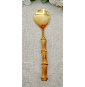 Servicio cuchara con mango de bambú. Material: bambú natural y acero inoxidable (con baño de oro el dorado). Medidas: 28,5 cm.