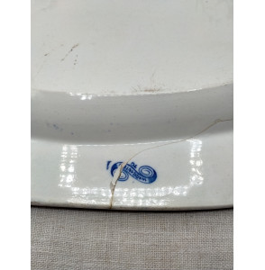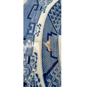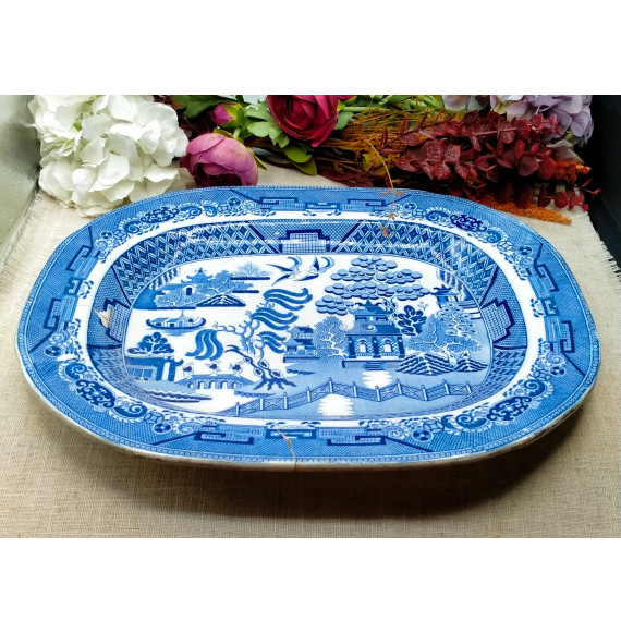 Magnífica fuente antigua Blue Willow grande de 45 x 35,5 cm. Siglo XIX. Tiene un desconchado en la parte superior.