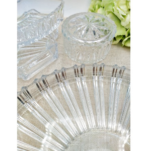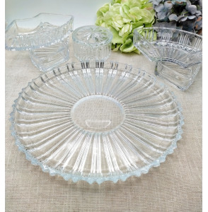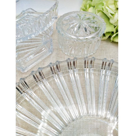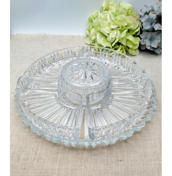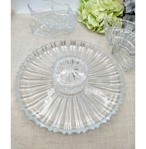 Mide 30 cm diametro. 30cm diam plato, tarro central 10cm diam y 5cm alto. Cuenco con tapa en el centro.
