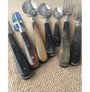 Caja de cubiertos formada por un tenedor, un cuchillo y una cuchara de plato principal y lo mismo de postre y una cuchara de café