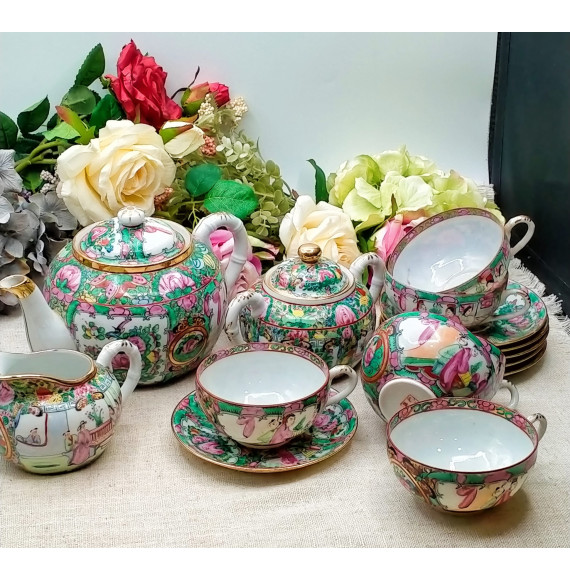 Juego de té: 6 tazas de té con plato y tetera, azucarero y lechera.