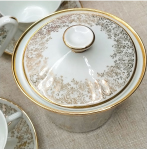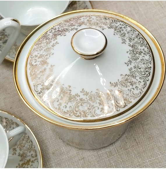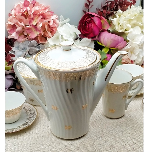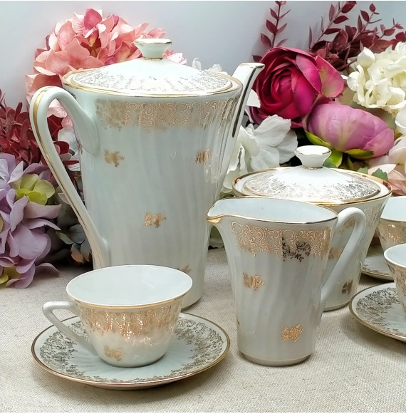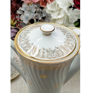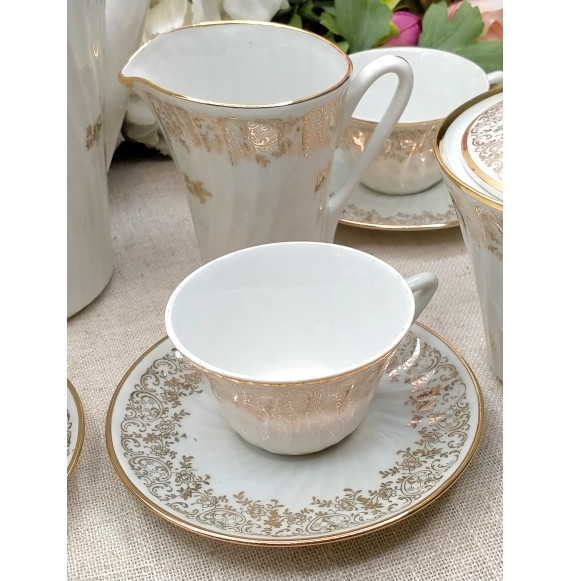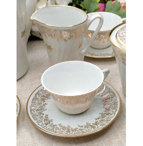 Juego de café de porcelana francesa compuesto de 12 tazas con platos, cafetera, lechera y azucarero. Destaca el brillo de la porcelana con su borde y dibujo de flores en oro.