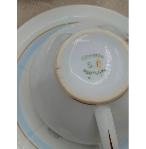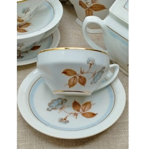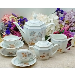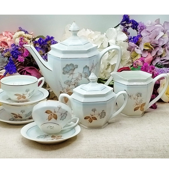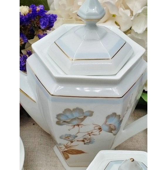 Juego de café GANTE en porcelana con flores en azul y marrón. Está compuesto por 10 tacitas, 10 platos, cafetera, lechera y azucarero