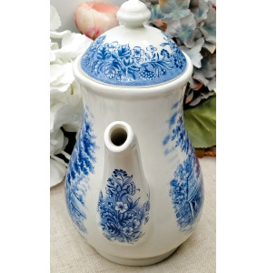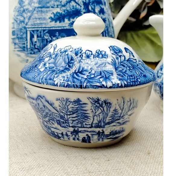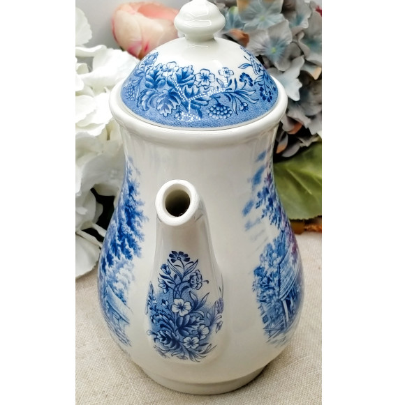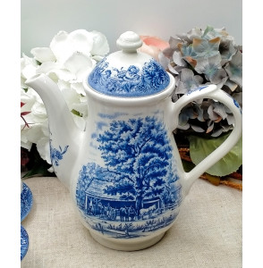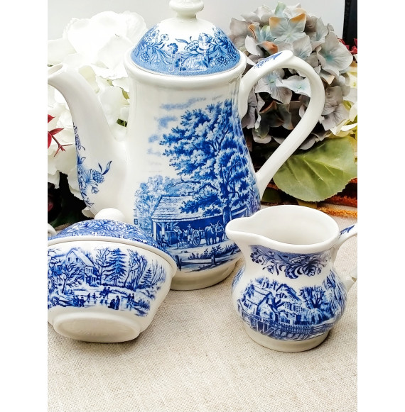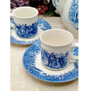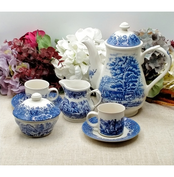 Juego de café compuesto por 12 tazas con plato, cafetera, lechera y azucarero de la marca Churchill. El asa de la lechera está pegada.